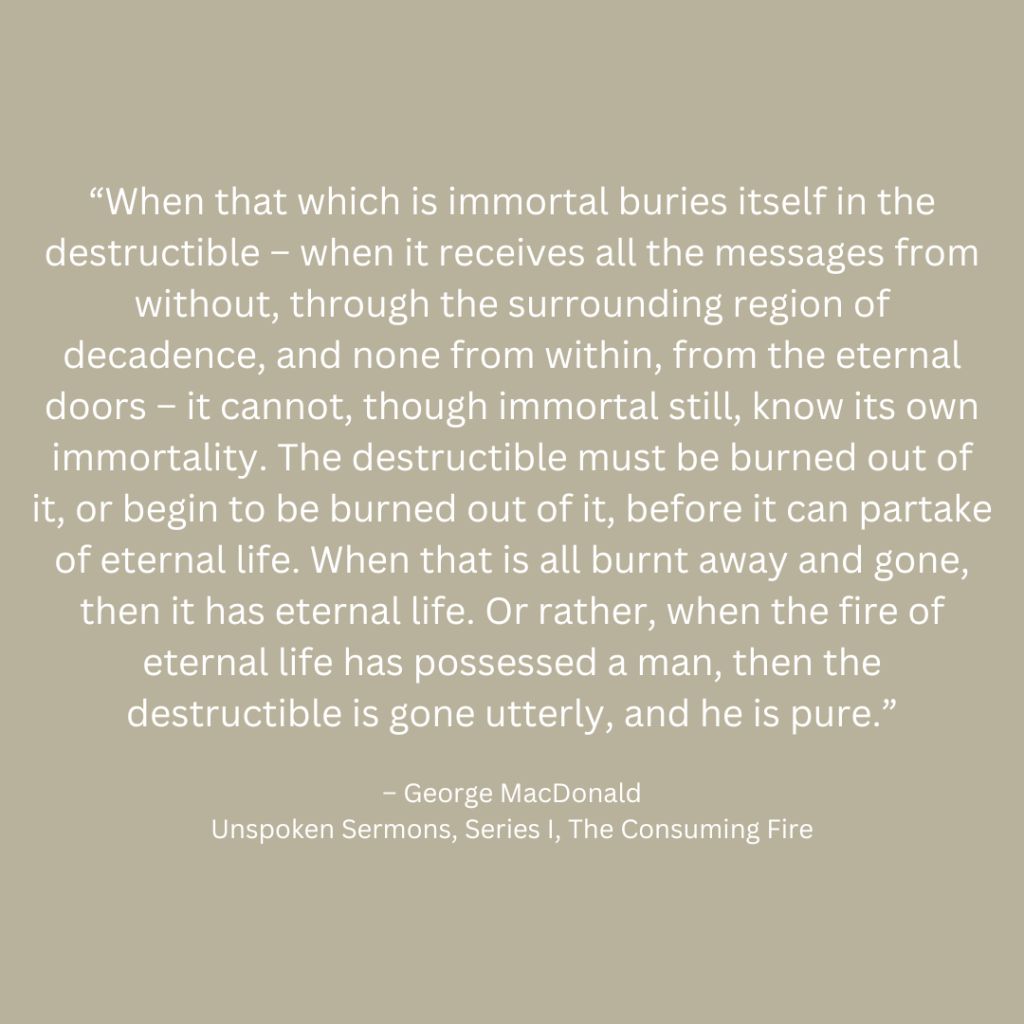 George MacDonald’s sentiment quoted above articulates better than I can the premise of this blog. To some, religion is a list of dos and don’ts as a means to an end, with The Law as a guide to achieving heaven. I, however, maintain, as did George, that this side of our mortality is a pathway of preparation for the eternal. Our life trials are the consuming fire that exposes the dross of our sinful self and skims it from the surface, purifying us through the process. In the end, I truly believe we will come face to face with our Heavenly Father and answer, not for our actions in the flesh, but for our heart’s condition, the motivations behind our actions, which is why we are warned over and over throughout the scriptures to guard our hearts “above all else” because our actions are a byproduct of the condition of our heart (Proverbs 4:23).